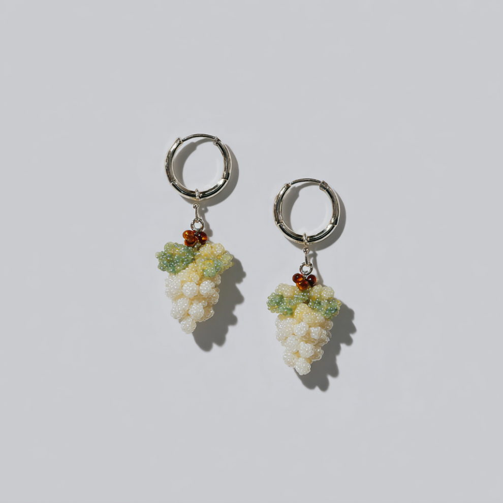 Серебрянные серьги-хупы с подвесками с виде гроздей винограда из посеребренного бисера.